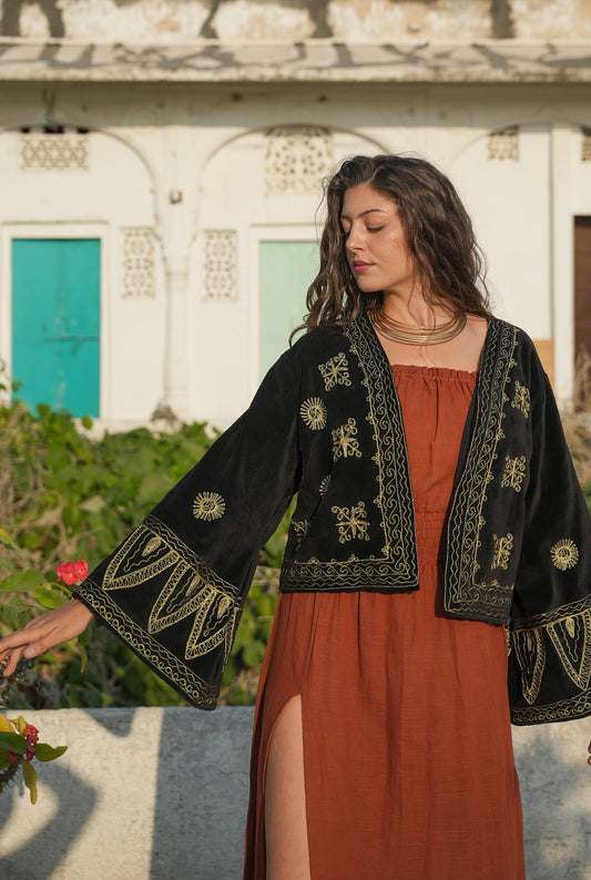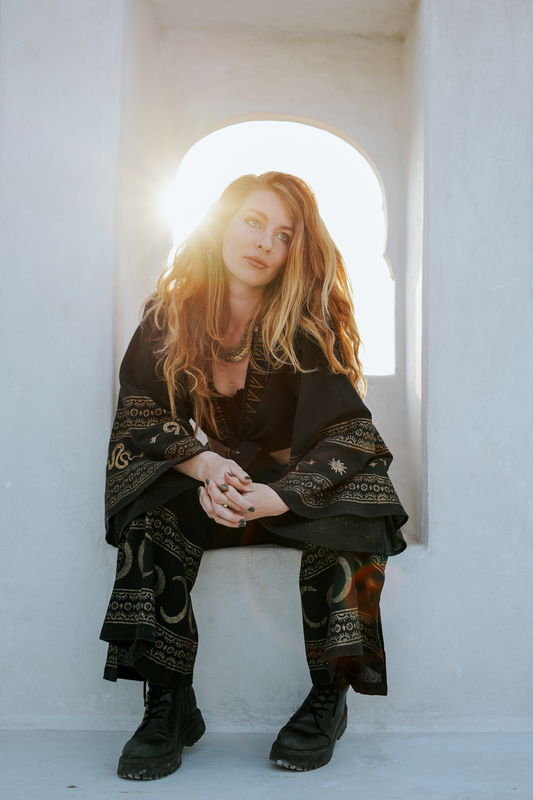 • Zwarte co-ord set met een vloeiende rok en top, versierd met subtiele slangen- en maansymbolen in gouden prints, perfect voor een bohemian festivaloutfit